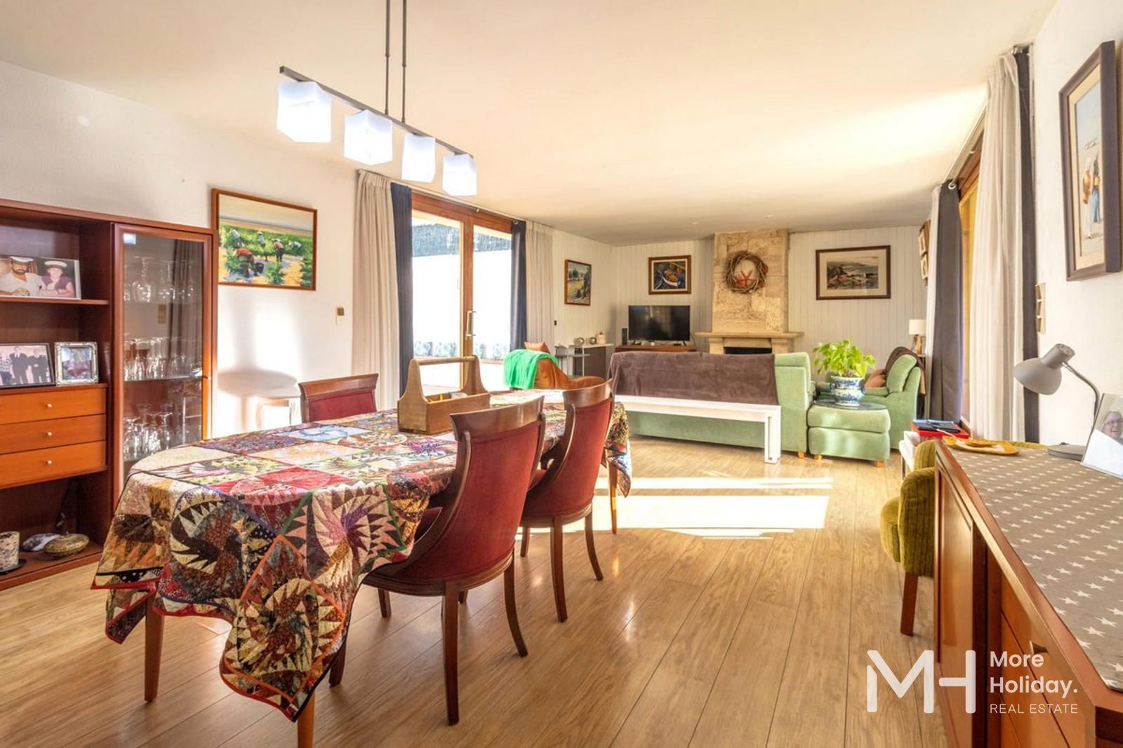 La planta principal, de 180 m², está concebida como una elegante y luminosa zona de día. Un espacioso hall de entrada conduce a un magnífico salón-comedor con chimenea, caracterizado por sus grandes ventanales que inundan el espacio de luz natural y crean una conexión fluida con las zonas exteriores. Desde aquí se accede tanto a un acogedor patio privado como a una amplia terraza junto a la piscina, logrando una armoniosa integración entre interior y exterior.