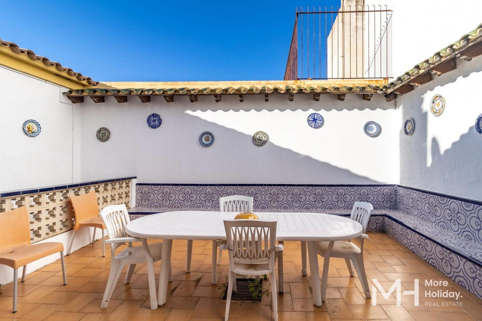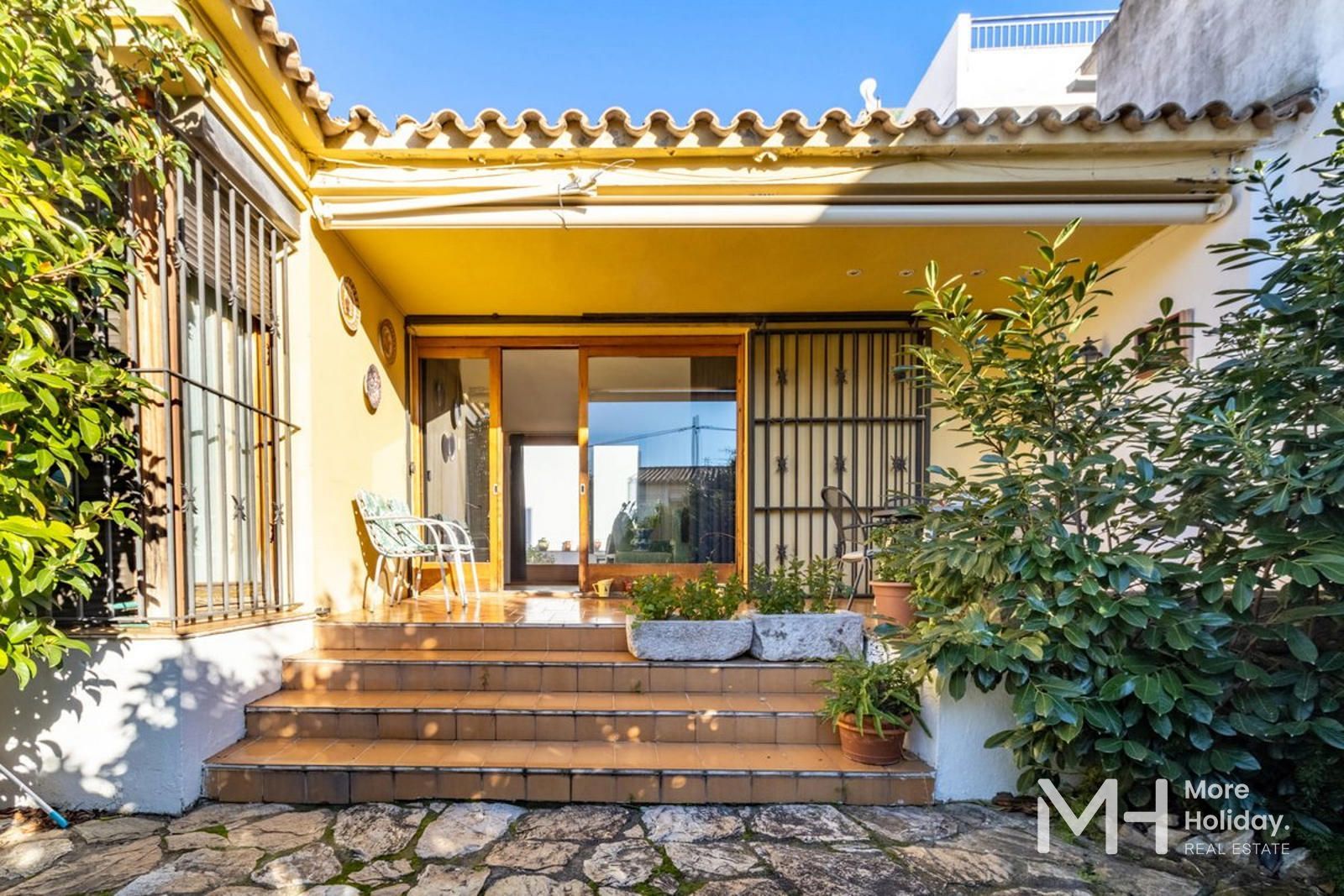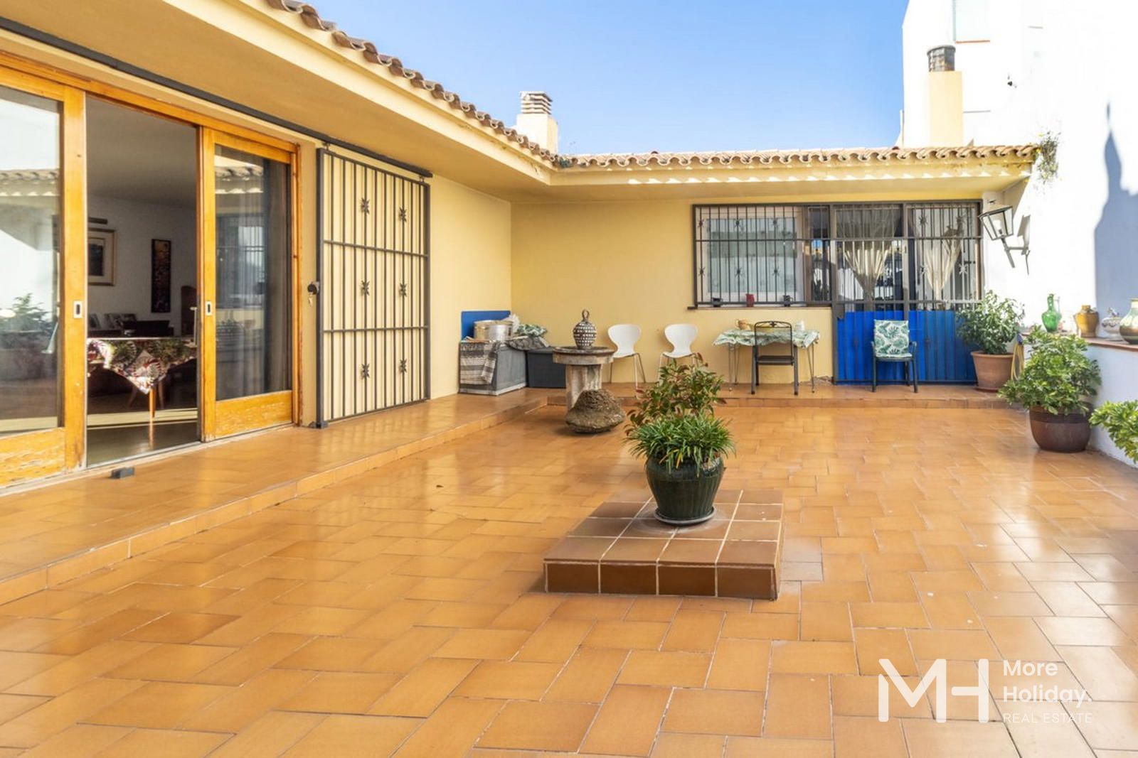 Retirada de la calle, la propiedad garantiza tranquilidad y privacidad, reforzadas por sus múltiples salidas a patios que amplifican la sensación de amplitud y bienestar. Su ubicación privilegiada permite un acceso inmediato a comercios y servicios, encontrándose a tan solo dos minutos de la playa.